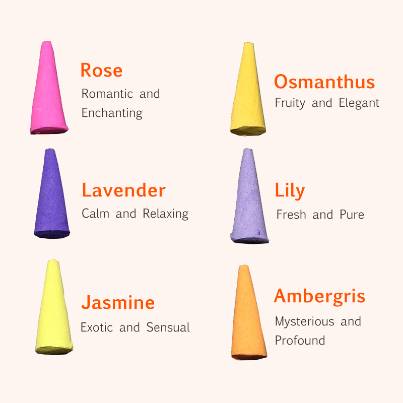 10 Diffient Scents of Incense Cones- Rose: Romantic and Enchanting; Lavender: Calm and Relaxing; Jasmine: Exotic and Sensual; Lily: Fresh and Pure; Osmanthus: Fruity and Elegant; Ambergris: Mysterious and Profound; Sandalwood: Earthy and Tranquil; Artemisia: Herbal and Clarifying; Green Tea: Refreshing and Serene; Agarwood: Rich and Mysterious.